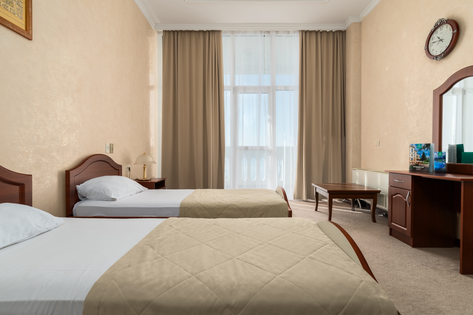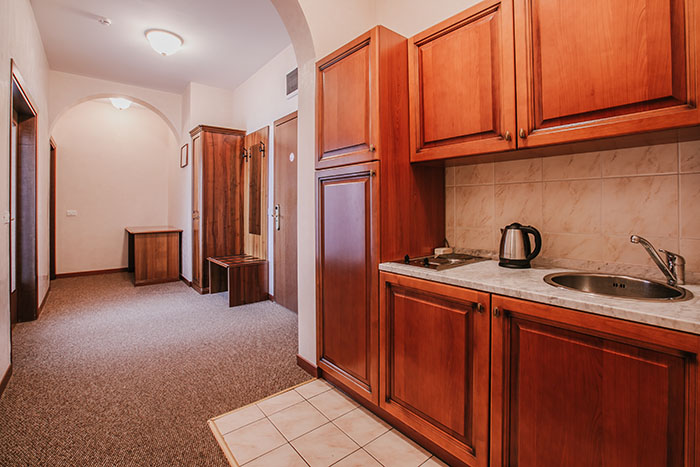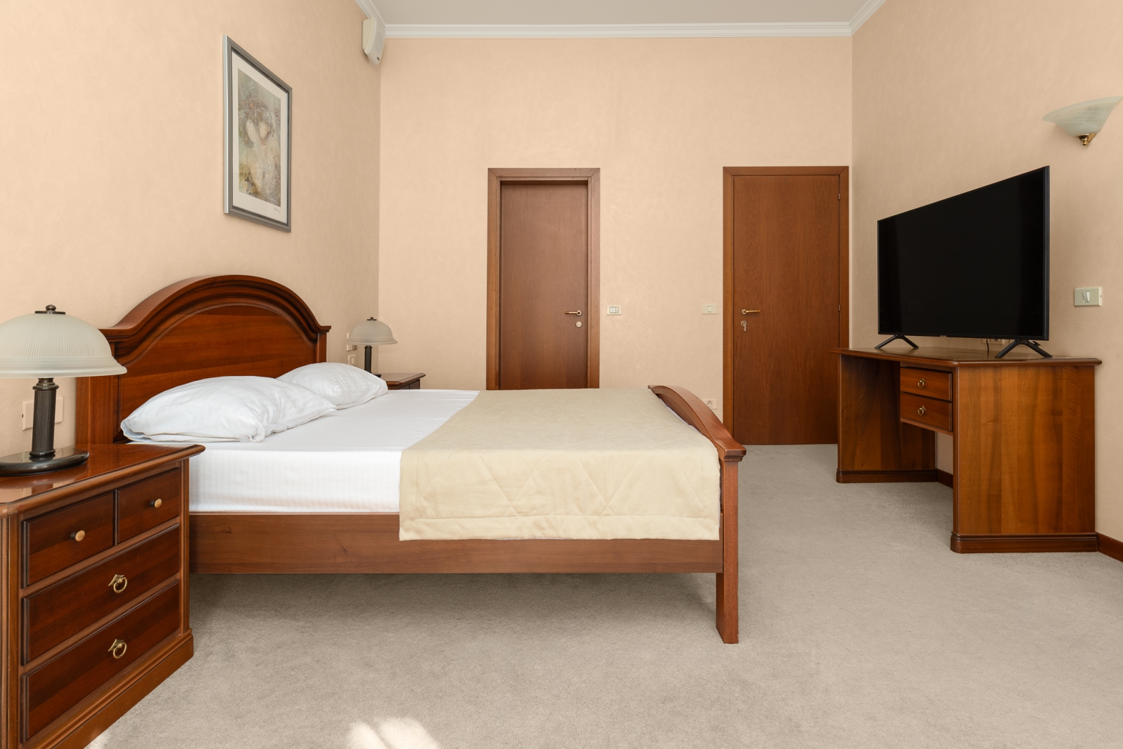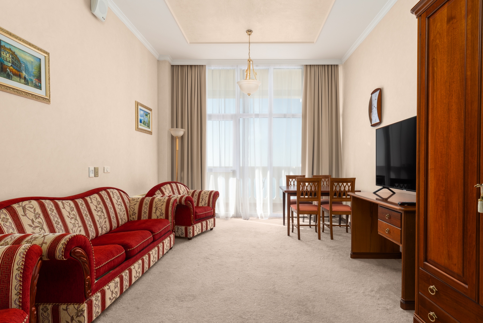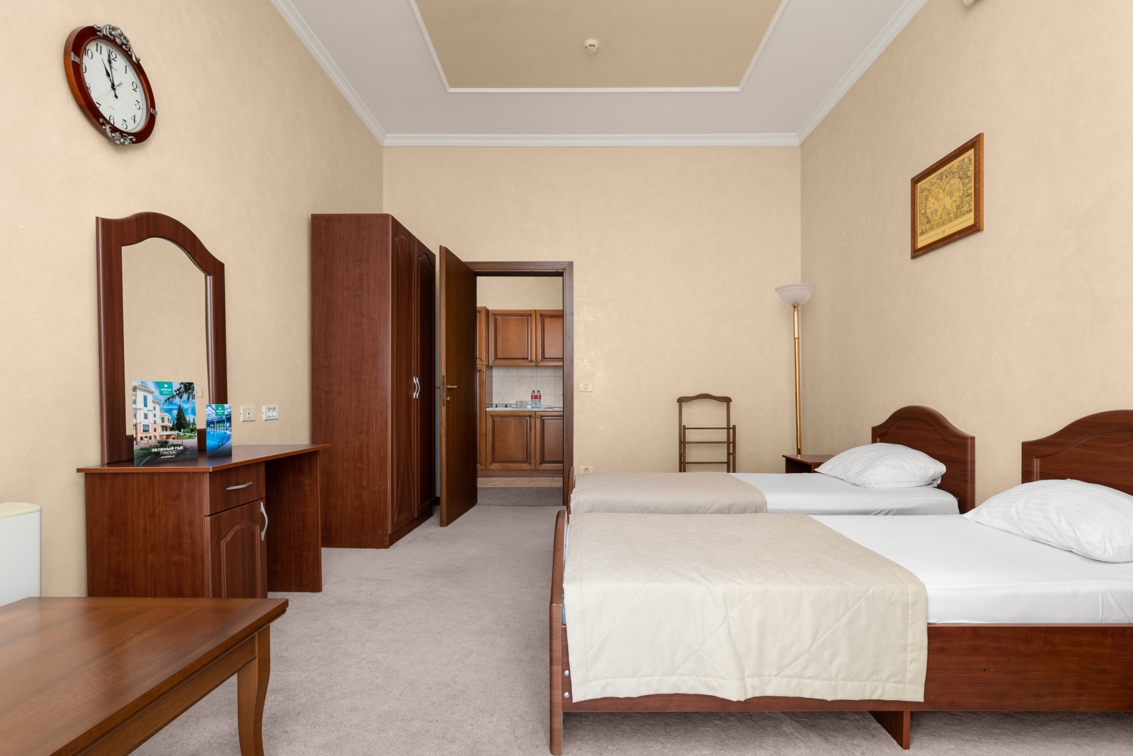 Площадь номера - 80 кв.м. 2 осн. места. 4 доп. места. Балкон. Кухня. Мебель: вешалка, диван раскладной, зеркало, кресла, кровати односпальные /одна двуспальная кровать, кухонная мебель, прикроватные тумбочки, стол, столик журнальный, стол обеденный, стулья, тумба, шкаф. Оборудование: гладильная доска, кондиционер, набор посуды, плита электрическая, сейф, телевизор, телефон, утюг, холодильник, чайный набор посуды, электрочайник. Санузел: с ванной/душем, тапочки, туалетные принадлежности, фен, халат. Сервис: Wi-Fi бесплатно, смена полотенец, смена постельного белья, уборка номера, услуги внутренней телефонной связи.