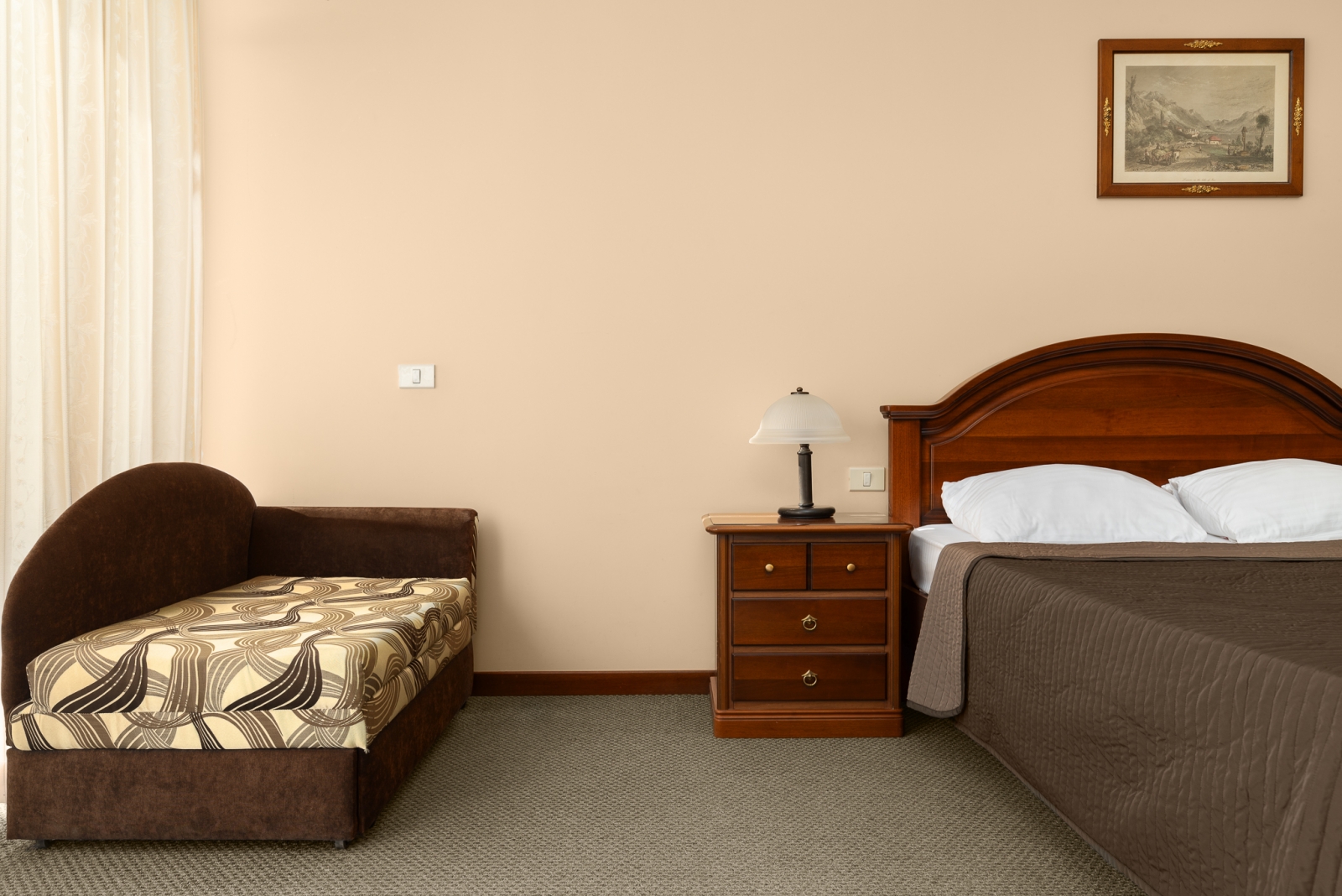 Площадь номера - 26 кв.м. 2 осн. места. 1 доп. место. Балкон. Мебель: вешалка, зеркало, кресло-кровать, кровать двуспальная, прикроватные тумбочки, стол, стул, шкаф. Оборудование: кондиционер, сейф, телевизор, телефон, холодильник, чайный набор посуды. Санузел: с ванной/душем, туалетные принадлежности, фен. Сервис: Wi-Fi бесплатно, смена полотенец, смена постельного белья, уборка номера, услуги внутренней телефонной связи.